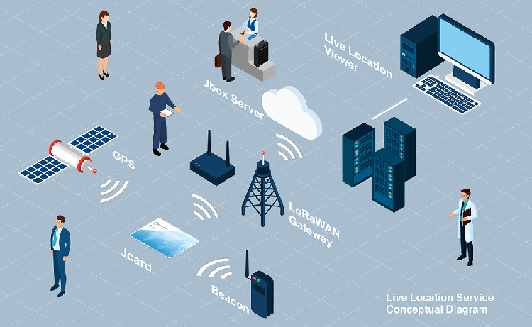 この革新的なソリューションサービスは、Jcardデバイス、Jboxネットワーク管理サーバ、基地局、中継器を使用して簡単にLoRaネットワークを構築できるサービスです。Jcardからの位置情報をJboxサーバで集約し、そのデータをAPIを通じてご提供する事により、位置情報を活用した業務の効率化を可能とします。